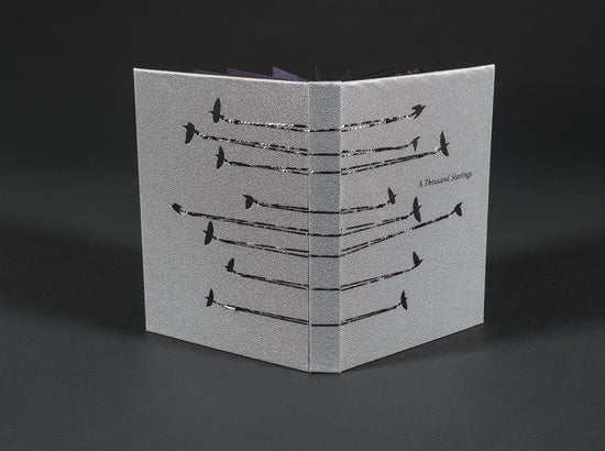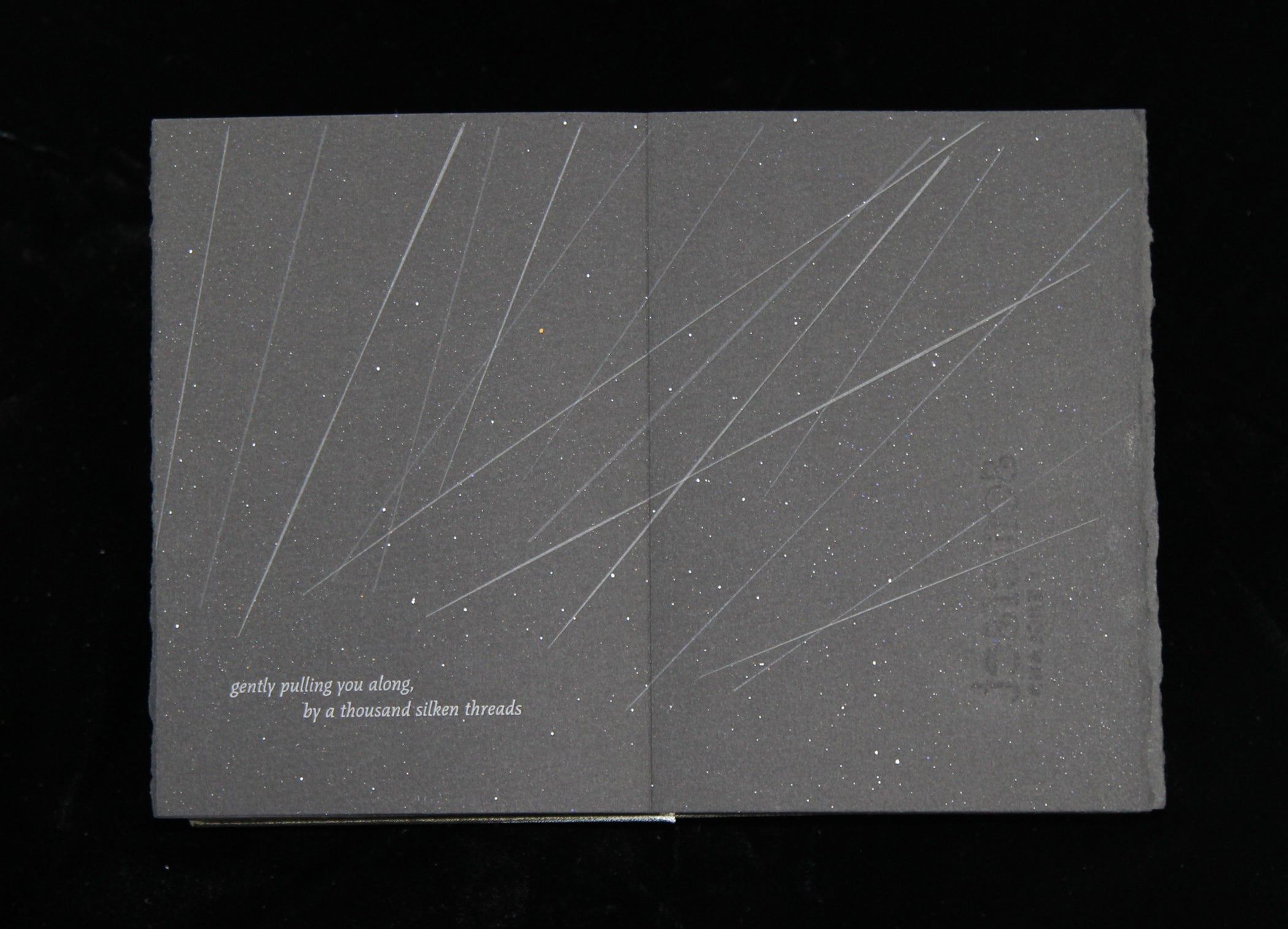 This limited edition book was created in an edition of thirty signed and numbered copies with artist’s proofs. Written, illustrated, and letterpress printed by Rhiannon Alpers. Letterpress printed with photopolymer plates and monotype, with an under layer of hand painted stars beneath, on Somerset Velvet Black. The endsheets are Fabriano Tiziano Anthracite and bound in Asahi Grey Crepe bookcloth. Foil stamped birds and title, this false accordion is masquerading in a Secret Belgian binding cover sewn with Italian film yarn.