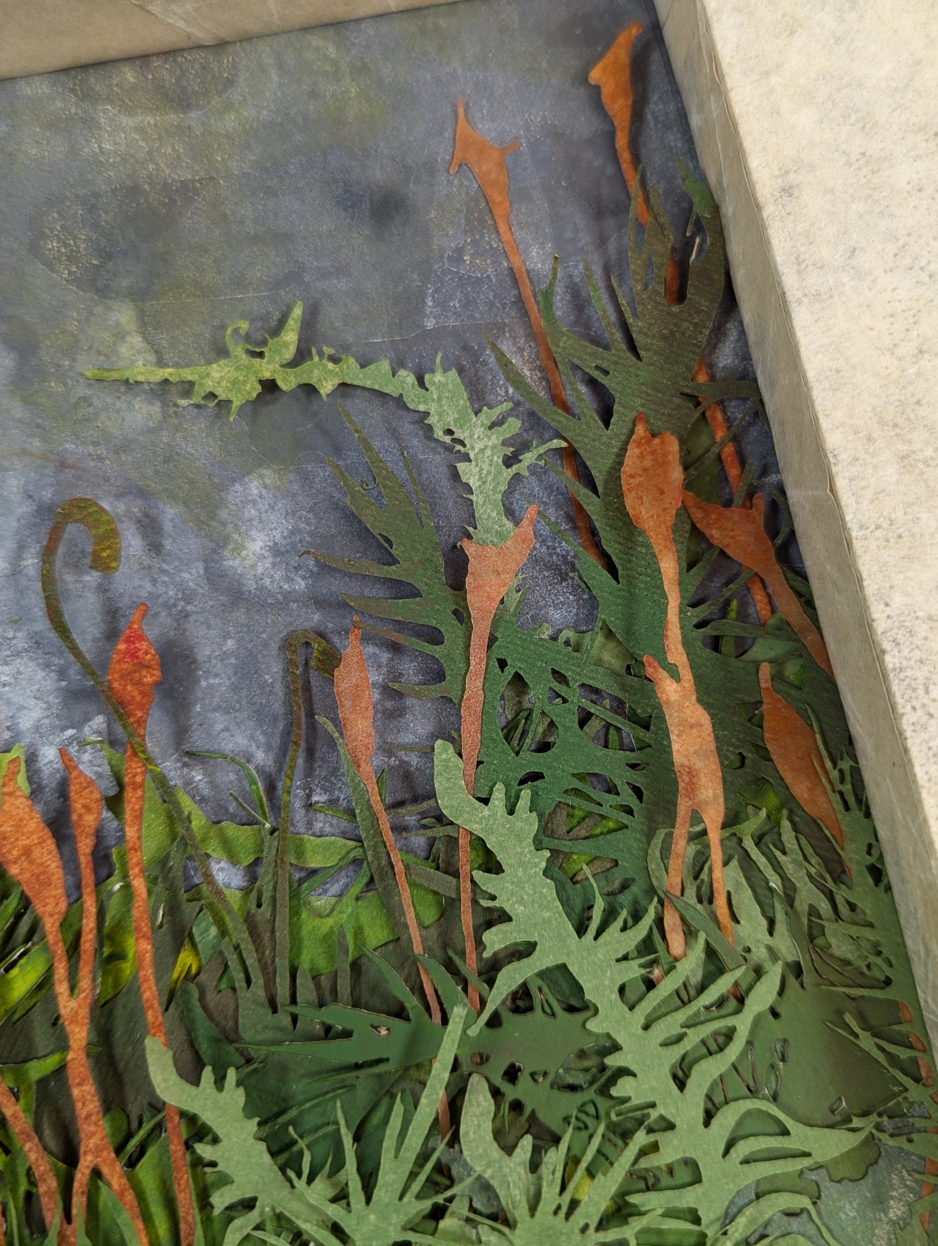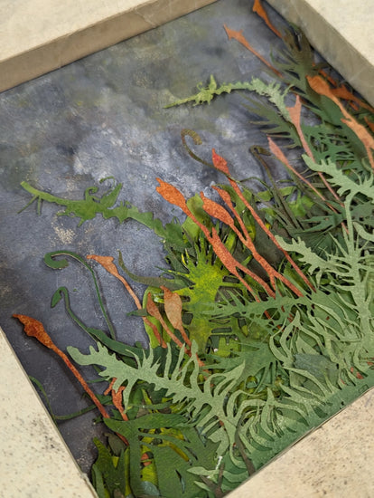The focal themes of this series centered on the surface, texture, and richness of lichen and moss. Through stenciled monoprints using hand cut and lasercut paper, often with a depth of 6-8 layers of cutouts, I explored methods to convey the intricate textural nuances inherent in lichen and moss at a macro level. By using color and layered monoprints, the pieces take on a visual depth with color palettes that reference the brilliance of these organisms in the natural world.