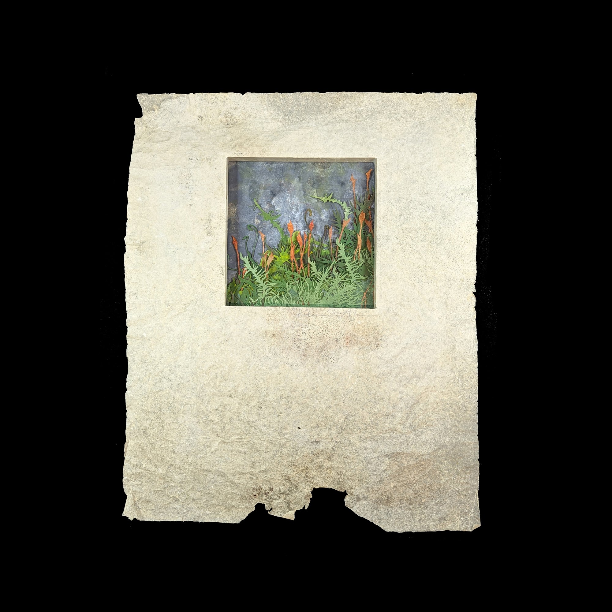 The handcrafted paper background frame creates a colorful portal, imbuing every print with a tangible three-dimensional vibrancy. The prints beneath are revealed using meticulously overbeaten and retted abaca paper sheets, along with a cut 3/4” raised window panel, lending the entire surface an intentionally unrefined, raw, and distressed texture.