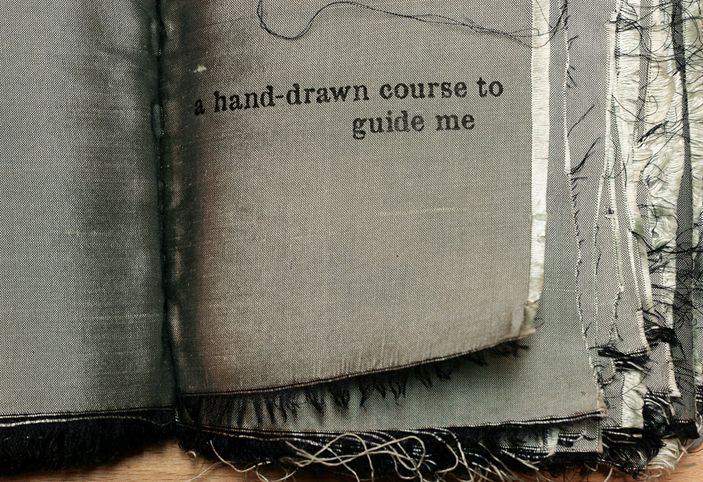 This one of a kind artist book explores the dreams of bring at sea in the night sky, in a tactile experience of fabric and milk painted wood. Through the varied soft frayed silk pages, viewers find the poem snuggled in amongst the dream like surface of silk.