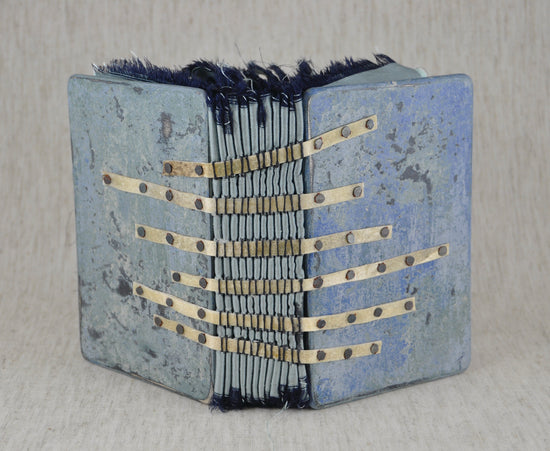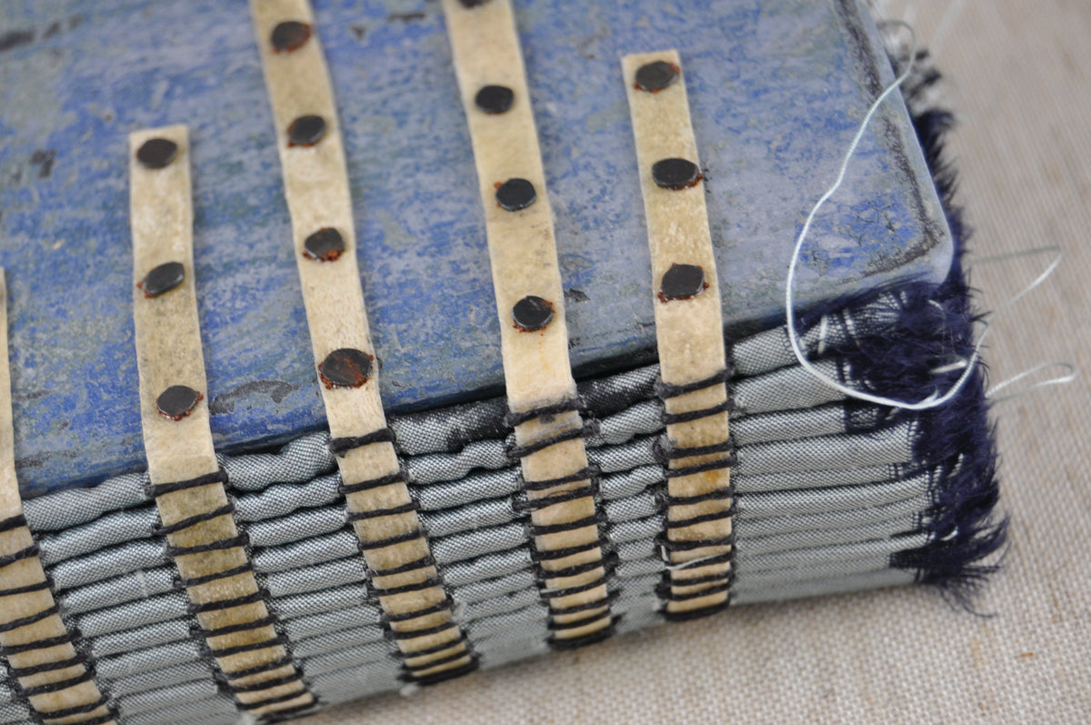 Materials used: milk painted wooden boards, sinew straps, omish hat box nails, silk fabric, image transfers