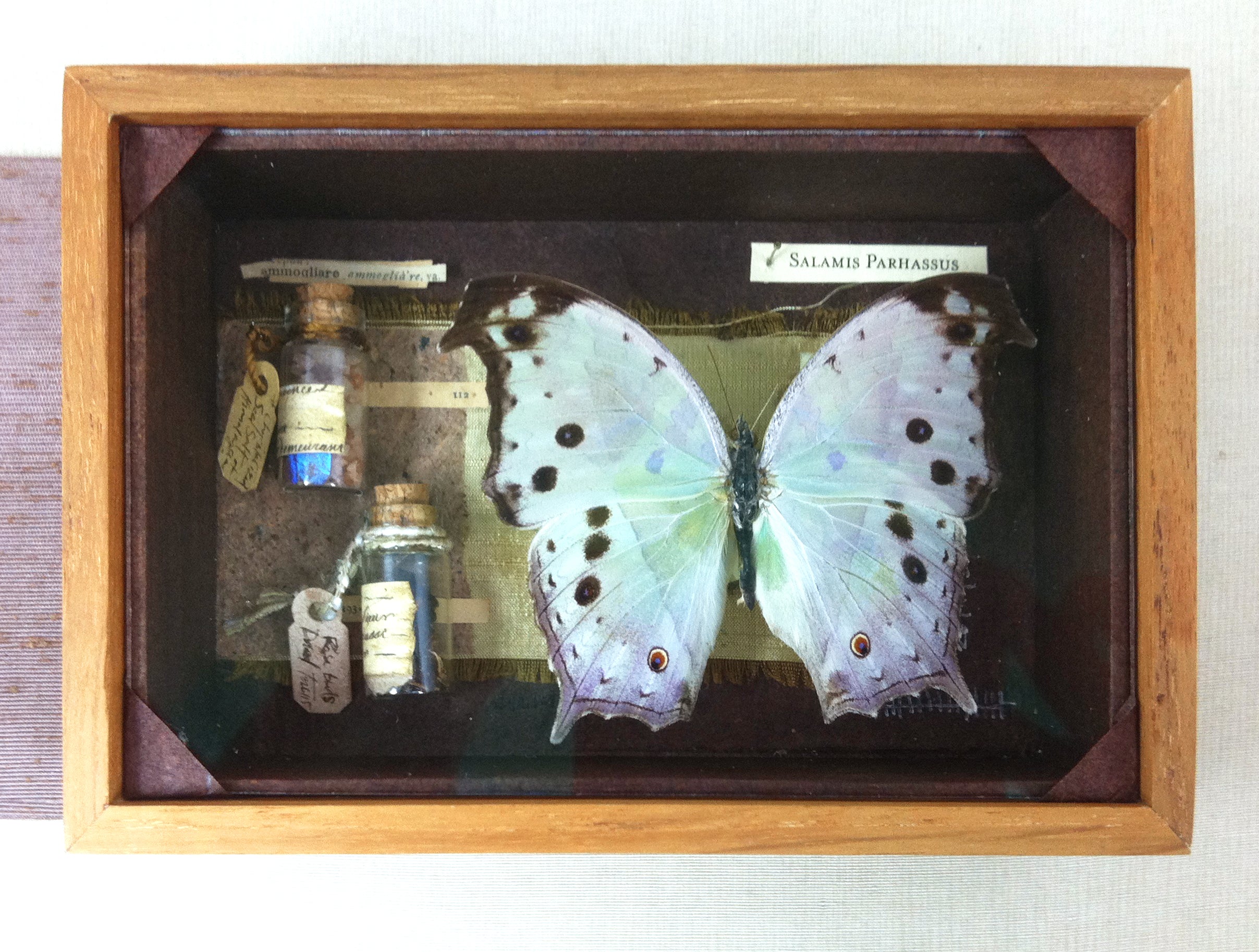 Materials Used: butterfly specimen, found lace scraps, silk fabric, silk bookcloth, found historical documents, bone, seed pods and stems, paste and marbled papers, hand-made papers (abaca and cotton)