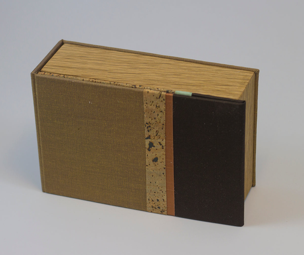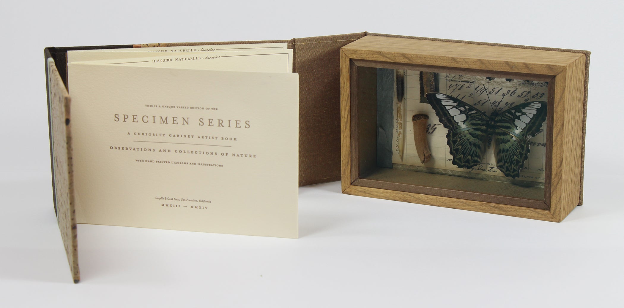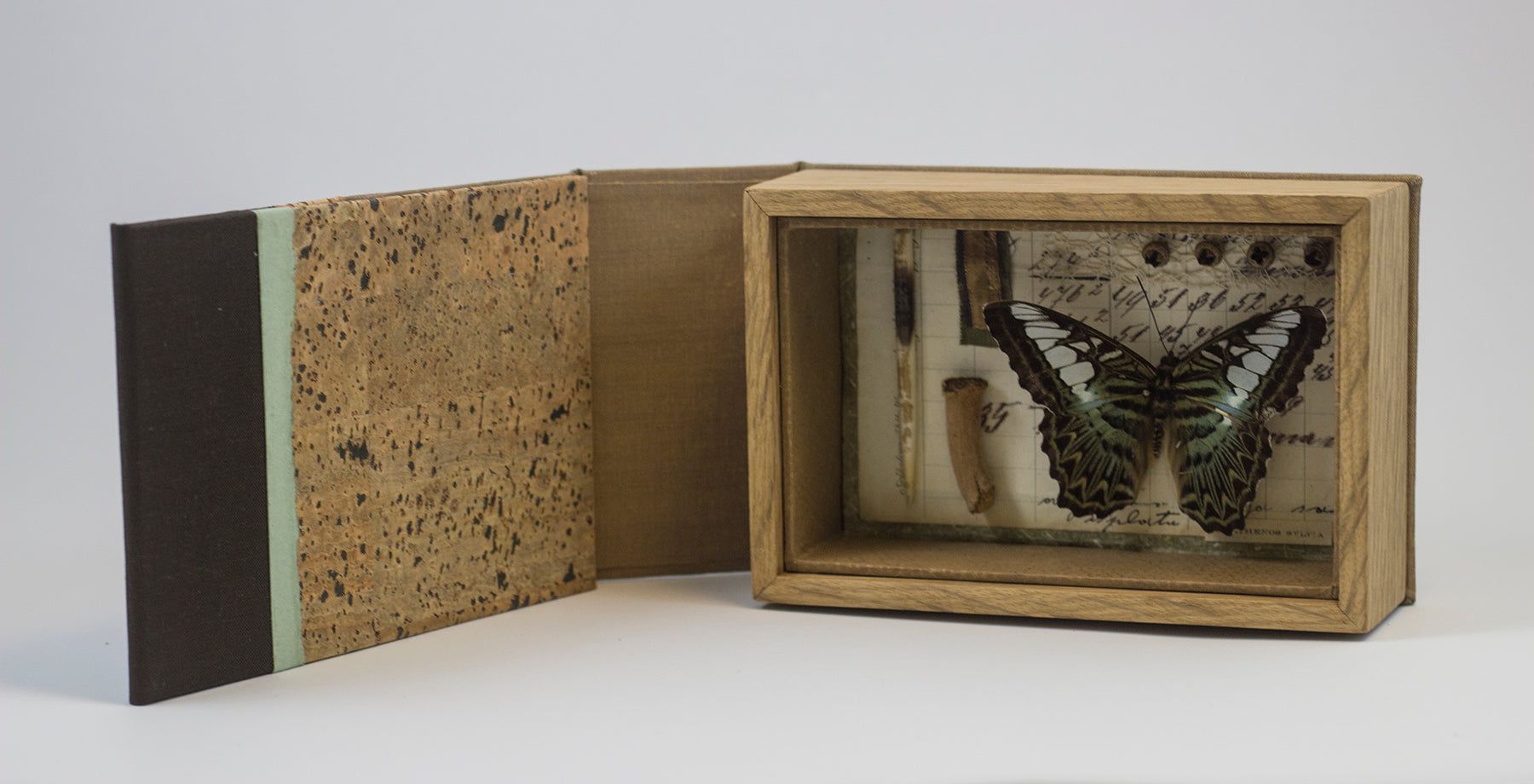 This sculptural artist book integrates a wooden-framed collage of specimens and found natural elements, creating a three-dimensional environment that tells a visual narrative. Serving as a cover for the frame, a hardcover foldout book opens to reveal both a concise history of cabinets of curiosities and an illustrated diagram detailing the objects contained within the display.