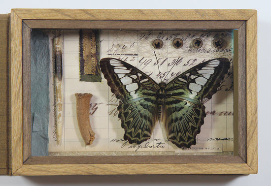 Materials Used: wild swallowtail butterfly specimen, found lace scraps, silk fabric, silk bookcloth, found historical documents, porcupine needle, seed pods and stems, cork paper, hand-made papers (abaca and cotton)