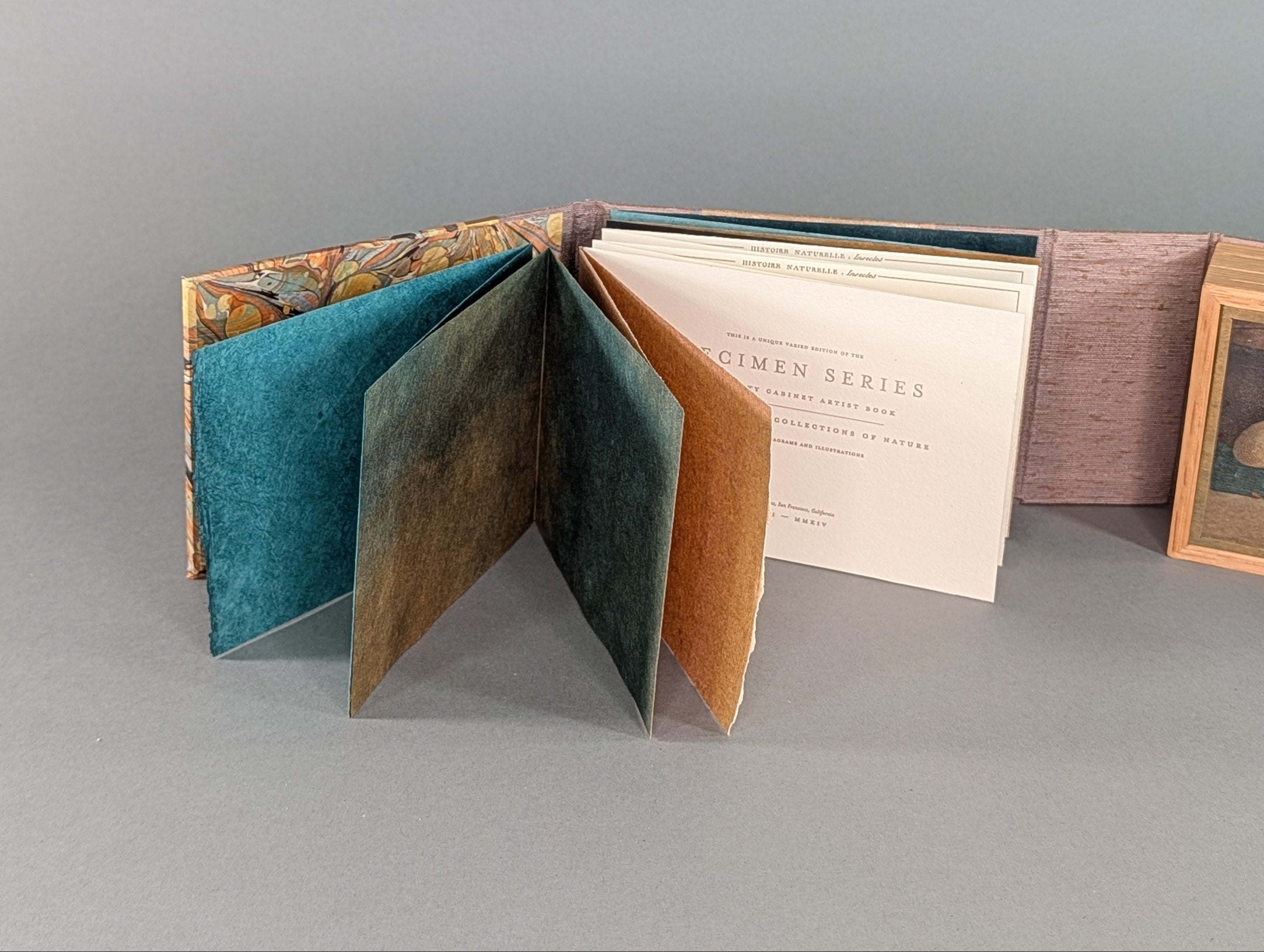 The piece is meant to be both a book (describing the history of cabinet of curiosites and detailing the specimens included) and a framed specimen shadow box. It can be read and displayed, and keeps the specimens protected from UV exposure when it's closed.