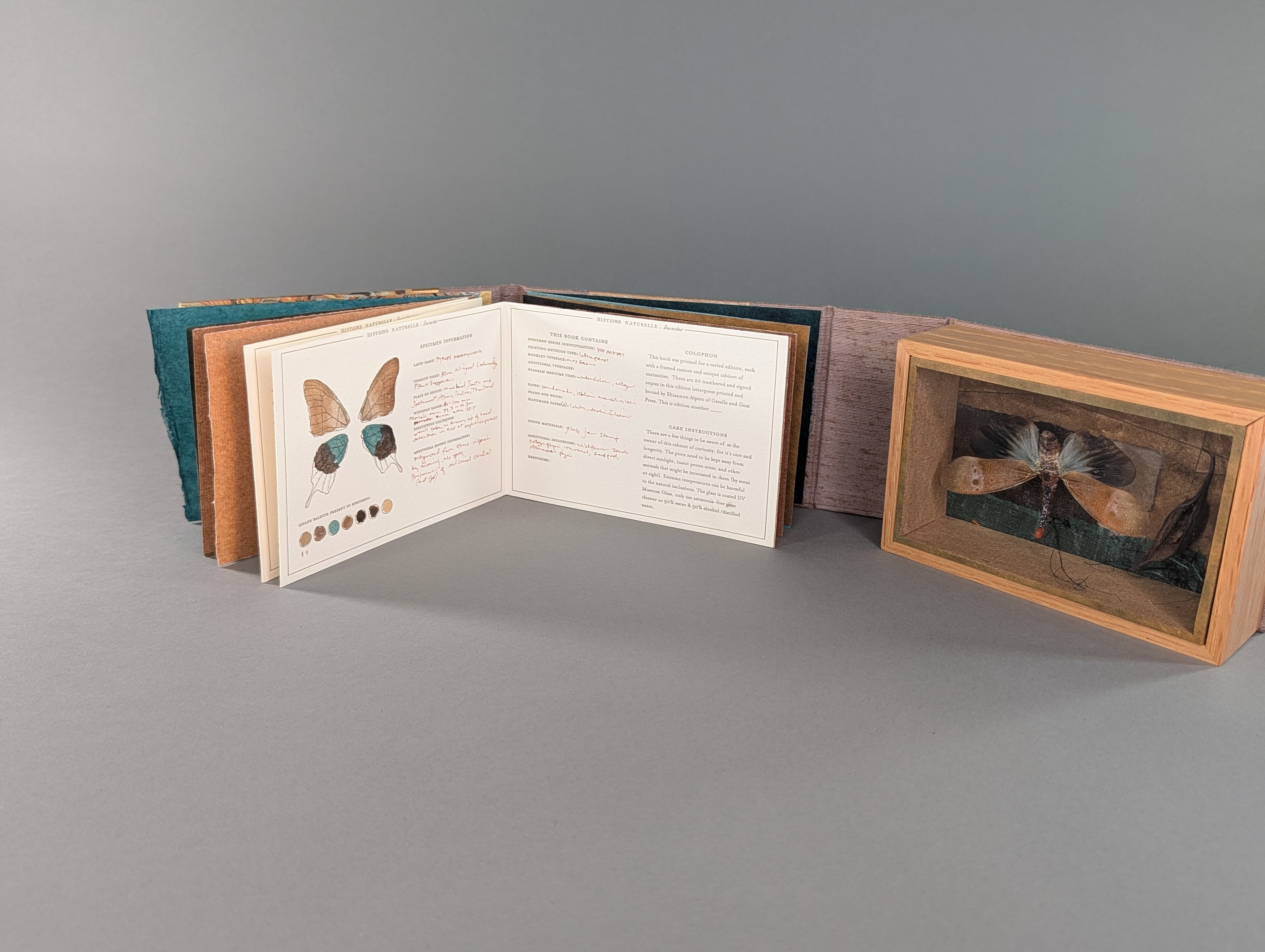 This sculptural artist book integrates a wooden-framed collage of specimens and found natural elements, creating a three-dimensional environment that tells a visual narrative. Serving as a cover for the frame, a hardcover foldout book opens to reveal both a concise history of cabinets of curiosities and an illustrated diagram detailing the objects contained within the display.