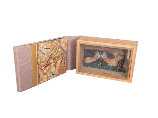 Originally conceived as sculptural studies of chrysalis forms, the series has expanded into a broader exploration of connections between plant, animal, and handmade papers. Through this ongoing investigation, the works weave together natural history, material experimentation, and the poetic possibilities of remnants, creating foldout pieces that unite collage, text, and illustration into a single contemplative experience.