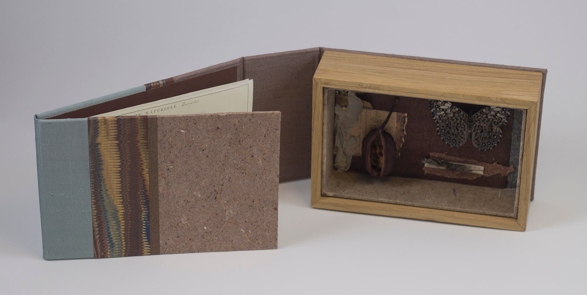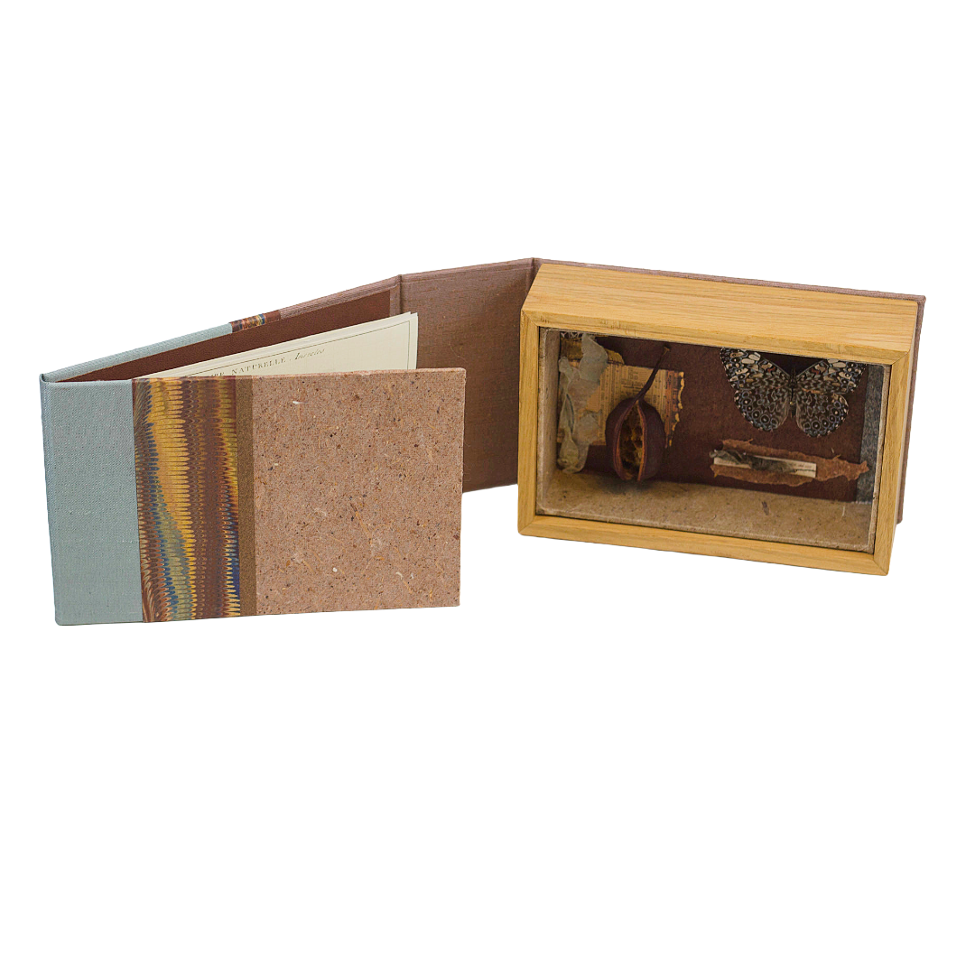 This sculptural artist book integrates a wooden-framed collage of specimens and found natural elements, creating a three-dimensional environment that tells a visual narrative. Serving as a cover for the frame, a hardcover foldout book opens to reveal both a concise history of cabinets of curiosities and an illustrated diagram detailing the objects contained within the display.