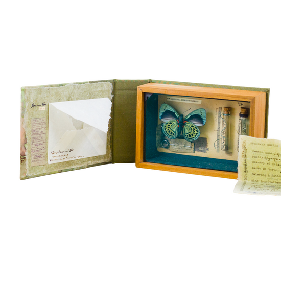 Materials Used: butterfly specimen, found lace scraps, silk fabric, silk bookcloth, found historical documents, porcupine needle, seed pods and stems, cork paper, hand-made papers (abaca and cotton)