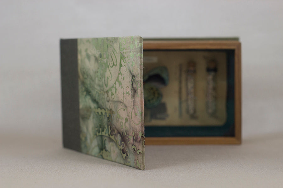 This sculptural artist book integrates a wooden-framed collage of specimens and found natural elements, creating a three-dimensional environment that tells a visual narrative. Serving as a cover for the frame, a hardcover foldout book opens to reveal both a concise history of cabinets of curiosities and an illustrated diagram detailing the objects contained within the display.