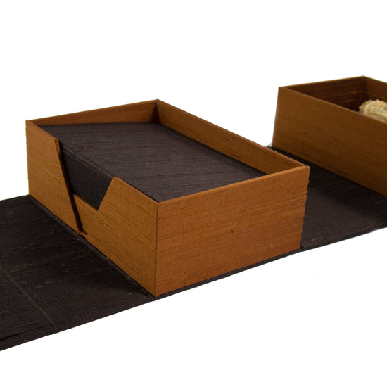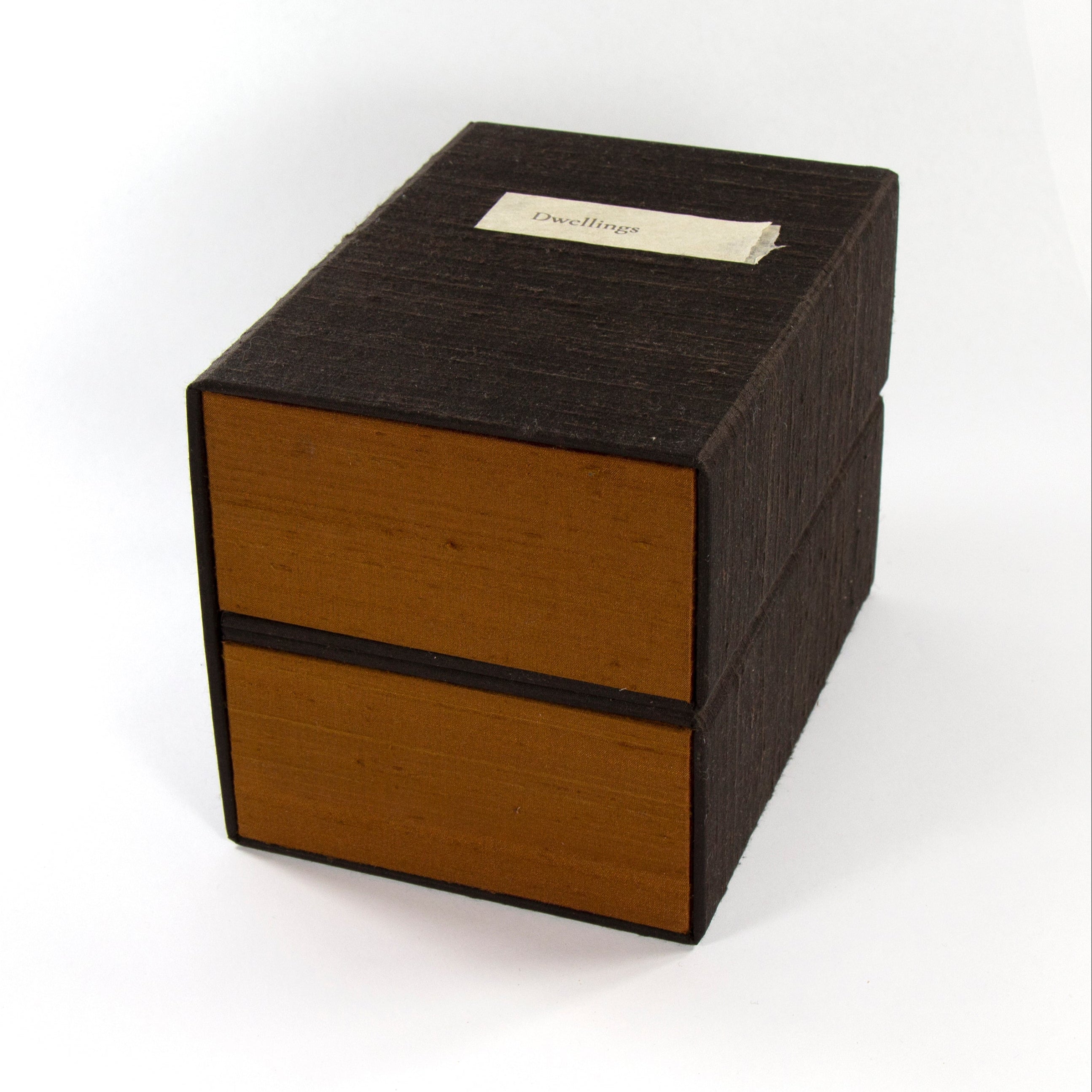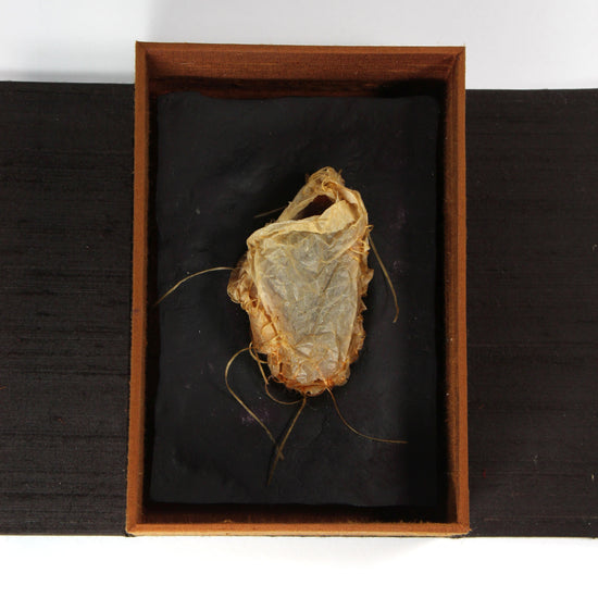 Each book/box within varied edition book contains unique handmade paper abaca pod in the box structure. The multi-panel unfurling two tray compartment box is made of handmade dupioni silk bookcloth in midnight purple and rust, created by the artist. Both the compartments hinged trays open, one to reveal a nested cocoon sculpture made of over-beaten abaca nested and the other side to reveal a book cover containing letterpress panel poem, a colophon, and a loose over-beaten abaca accordion sculptural book in the other.