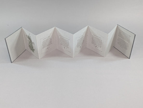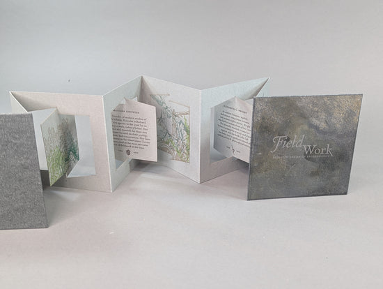 Inspired by four women naturalists of the 1900s, this swing panel accordion binding was produced in continuation of the series. This edition is part of a series of books entitled "Field Work," which looks deeper into the lives and discoveries of early women scientists. Meant to both educate and inspire the reader about the world of women in bryology in a playful form, it is part of an ongoing series.