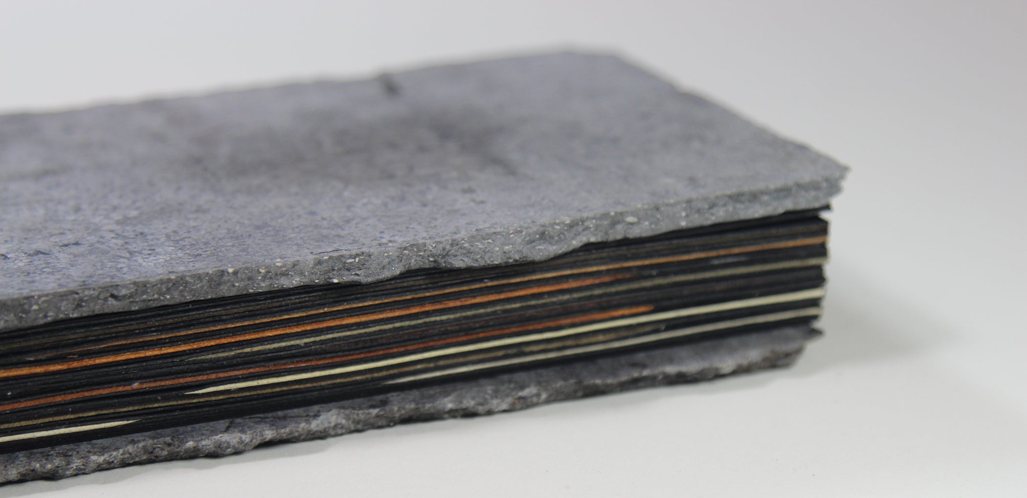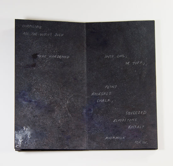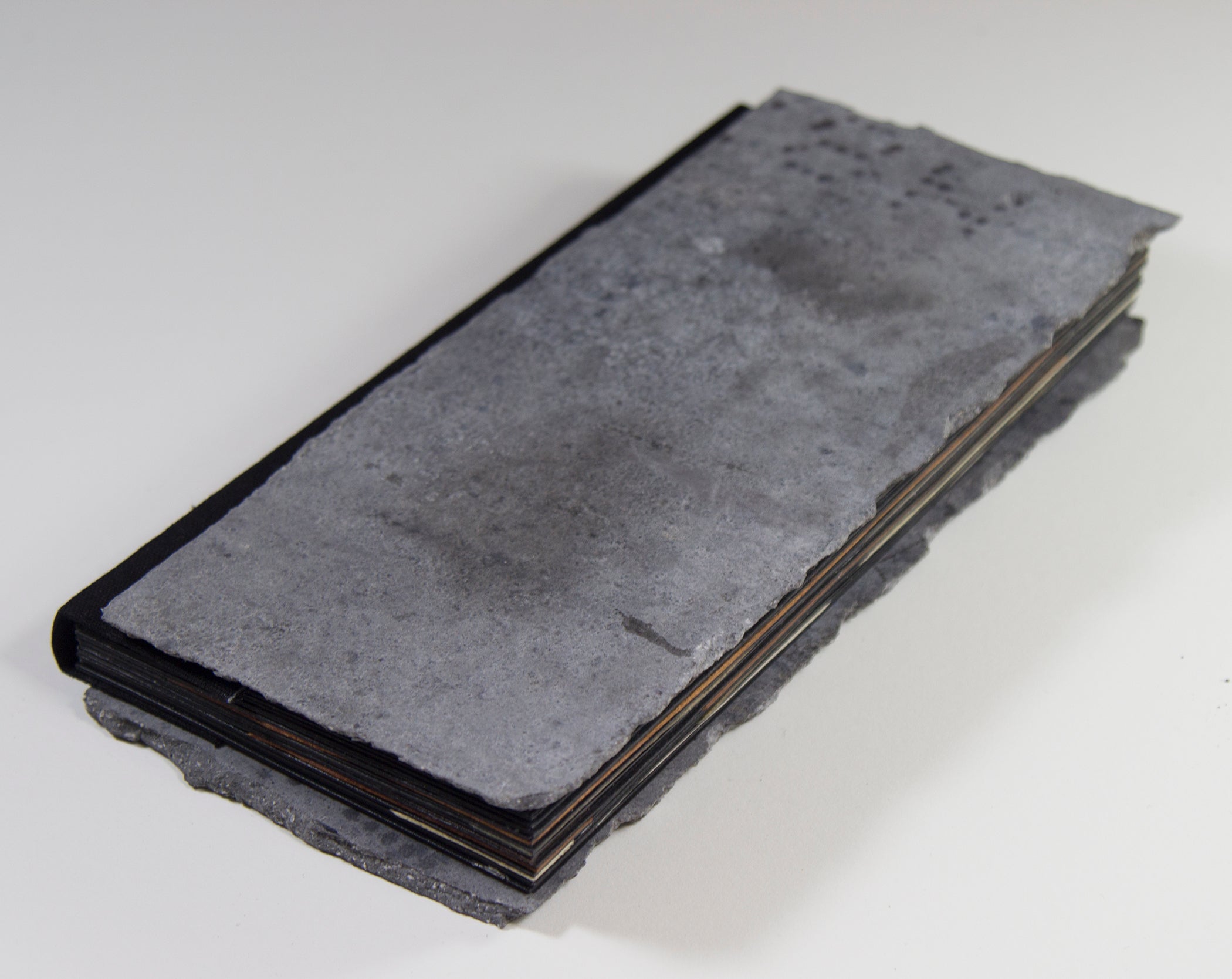 The artist book is in an edition of two, and bound with hand-cut slate tile covers sourced from found materials. The media for this books is mono-printed backgrounds , and polymer plates on the letterpress. The type was created using Penelope's handwriting converted to polymer plates print the pages.