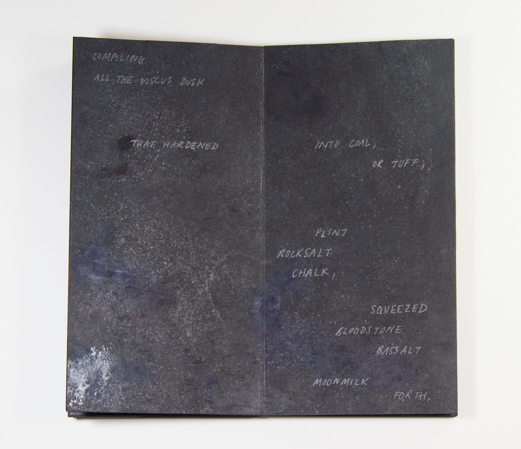 Bound in a flush-mounted board book style, the work incorporates colored leather inserts peeking through segments at the fore-edge, evoking the striations of sedimentary rock. Its substantial weight and dense surface invite reflection on the immensity of the universe, drawing parallels between the mineral foundations of geology and the mysteries of space.