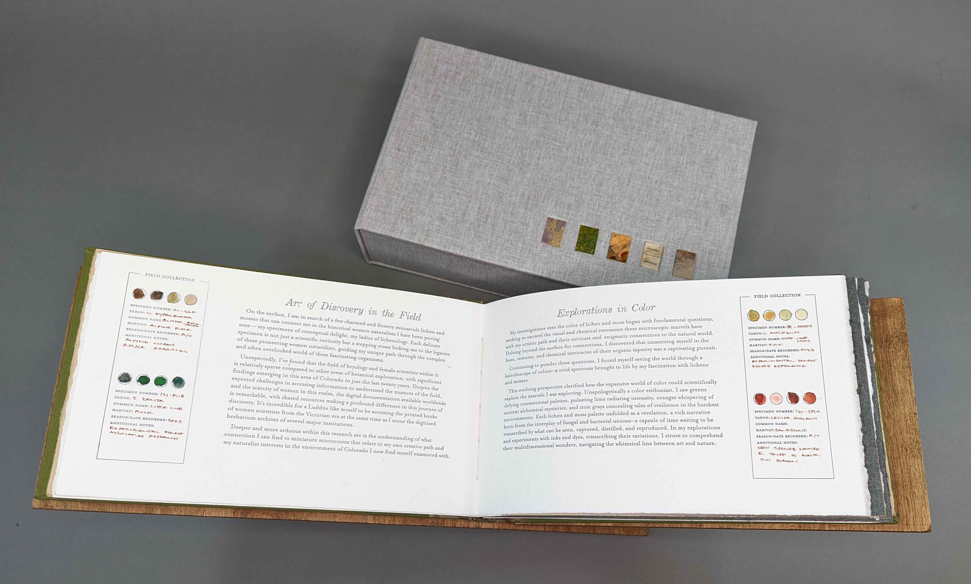 This project has deepened my understanding of lichens' interconnectedness to their surroundings, particularly within the Colorado Front Range landscape. It has revealed the complex ways in which these lichens interact chemically, biologically, and environmentally with their hosts. As an artist's book, the medium allows for multidimensional stories to take shape and be accessible to the viewer in both a sequential and spatial form. The process of going through this book should be a journey for the reader, engaging with the story visually, tactically, and creatively, interpreting the intertwining of my artistic explorations and the scientific discoveries of female naturalists. It is through the unfolding, unearthing, and untangling that we all come to discovery, which challenges and propels me to create these types of books.