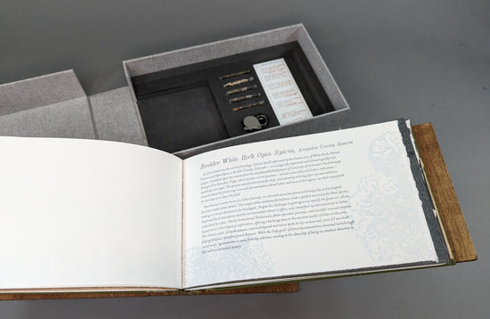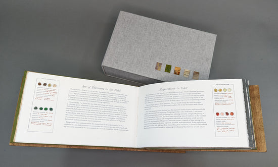 This edition was written, designed, printed, and bound by Rhiannon Alpers of Gazelle and Goat Press in Denver, Colorado. Using a combination of wood type, polymer plates, and laser cutting, the artist collaged and decorated the book by hand. Field collection specimen panels are illustrated with a combination of watercolors, inks, and natural pigments. The oversized Latin taxonomy specimen names are mono-printed using wood type and alternative ink processes. The handmade lace paper chapter enclosures are made using over-beaten abaca pulp, wall-sprayed for a textural effect. Wherever possible, the materials and media used are documented with the specimen records themselves for reference.