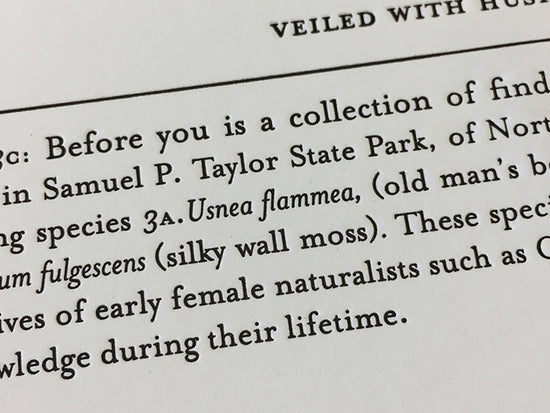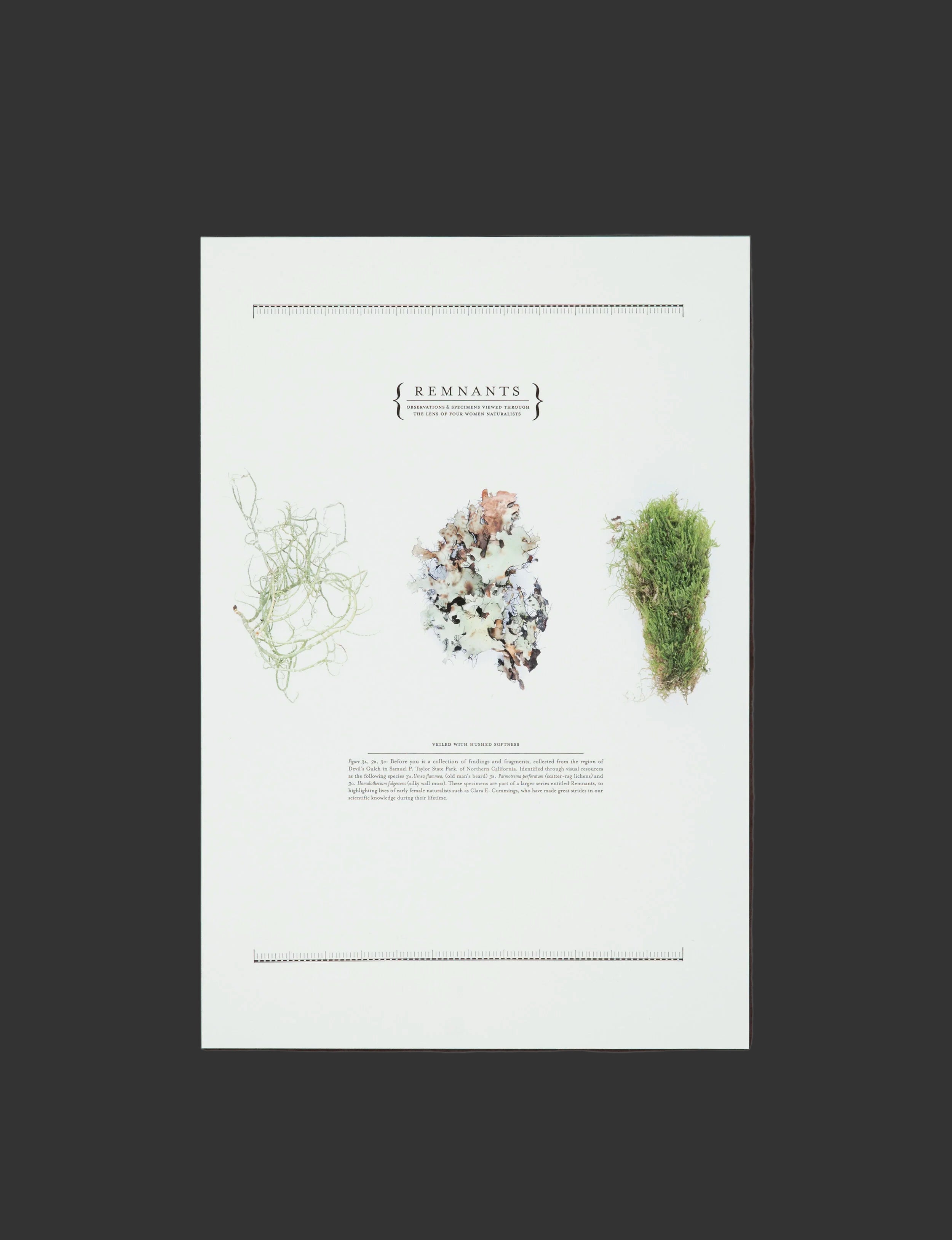 as the following species 3a. Usnea flammea, (old man’s beard) 3b. Parmotrema perforatum (scatter-rag lichens) and 3c. Homalothecium fulgescens (silky wall moss). These specimens are part of a larger series entitled Remnants, to highlighting lives of early female naturalists such as Clara E. Cummings, who have made great strides in our scientific knowledge during their lifetime.