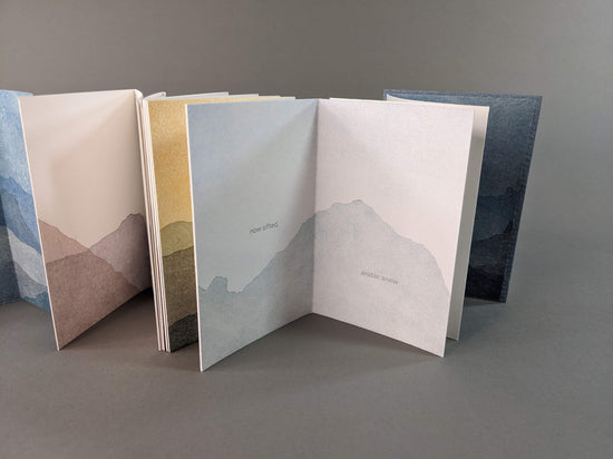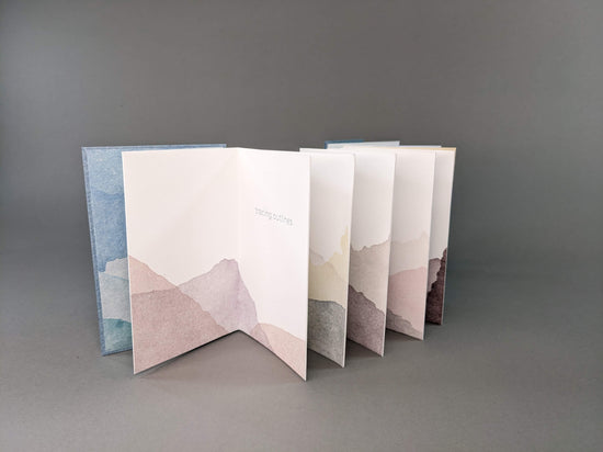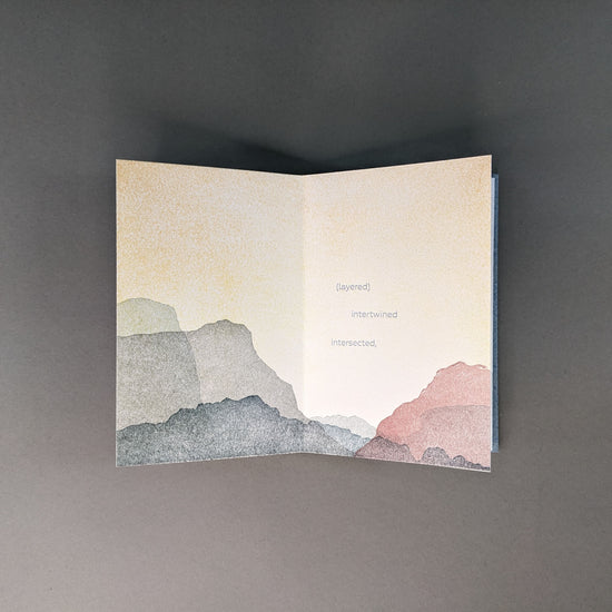 The book is letterpress printed on Cranes Lettra Bright White, using polymer plates for the type and magnet sheet monoprint for the images. The endsheets are digitally printed on Hiromi paper kozo natural. The cover is foil-stamped and made of laminated layers of laser-cut St. Armands handmade paper, with a false accordion binding.