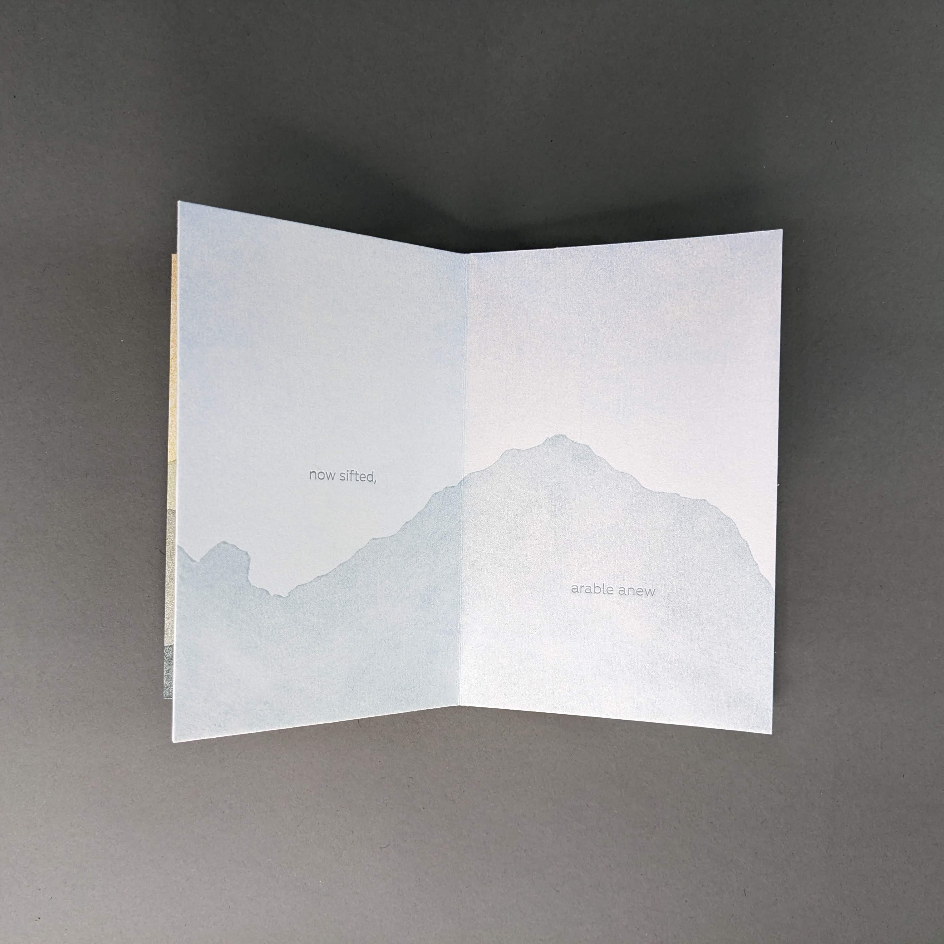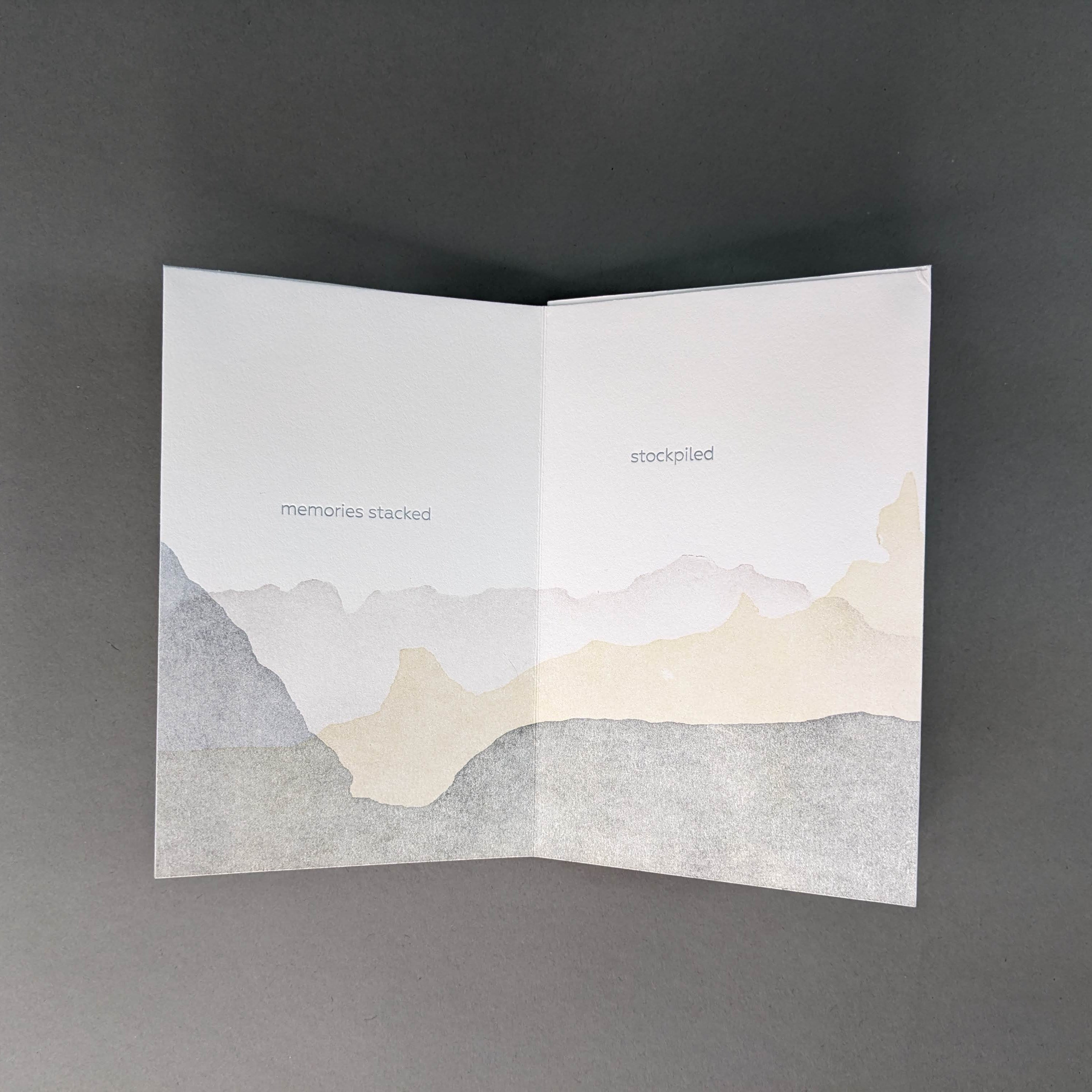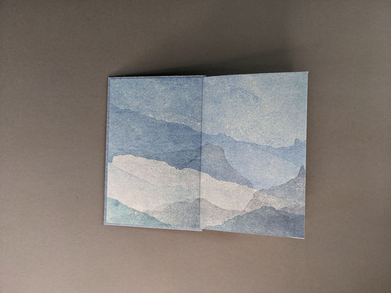 In contrast, the cover portrays the terrestrial landscape of the Rocky Mountains as visible from the artists’ studio. The shift in perspective symbolizes the act of taking an inventory of all the places one could go or have been – especially when it’s not possible to do so; COVID.