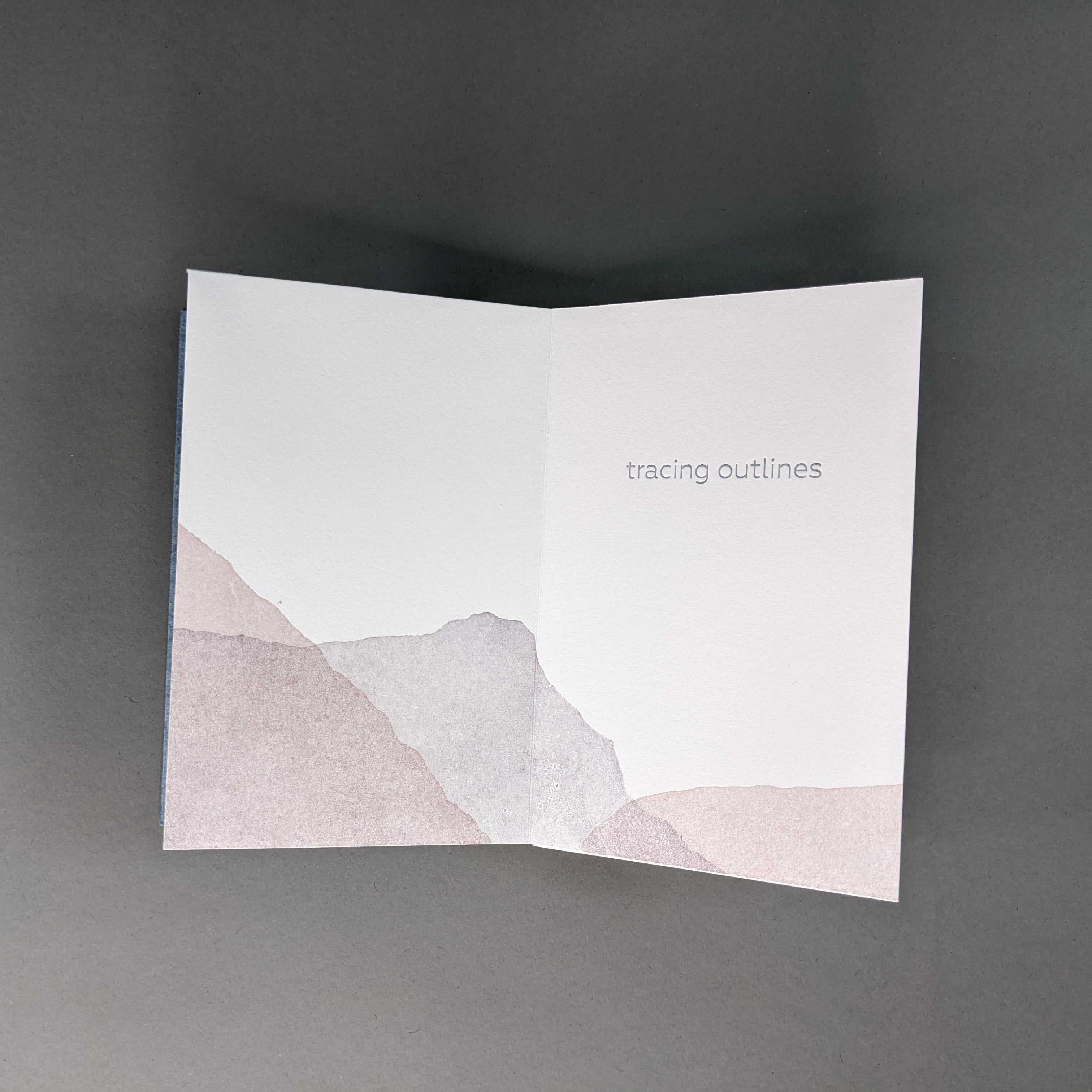 Tracing Images compiles a multitude of layered shapes to reconstruct landscapes, stemming from aerial views of the places the author has lived. Created using cut sheet magnets and monoprinting, the shapes themselves intertwine and overlay throughout the book, to become landscapes in their own right. The layered shapes illustrate the melding of concept of place over ones’ lifespan, through many homes, cities, travels and countries.