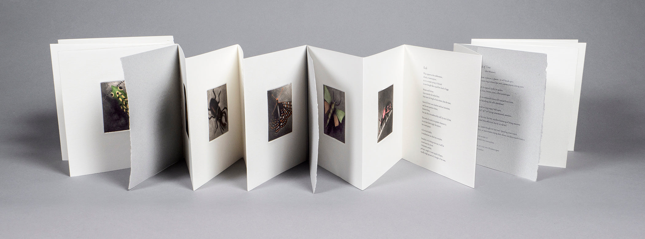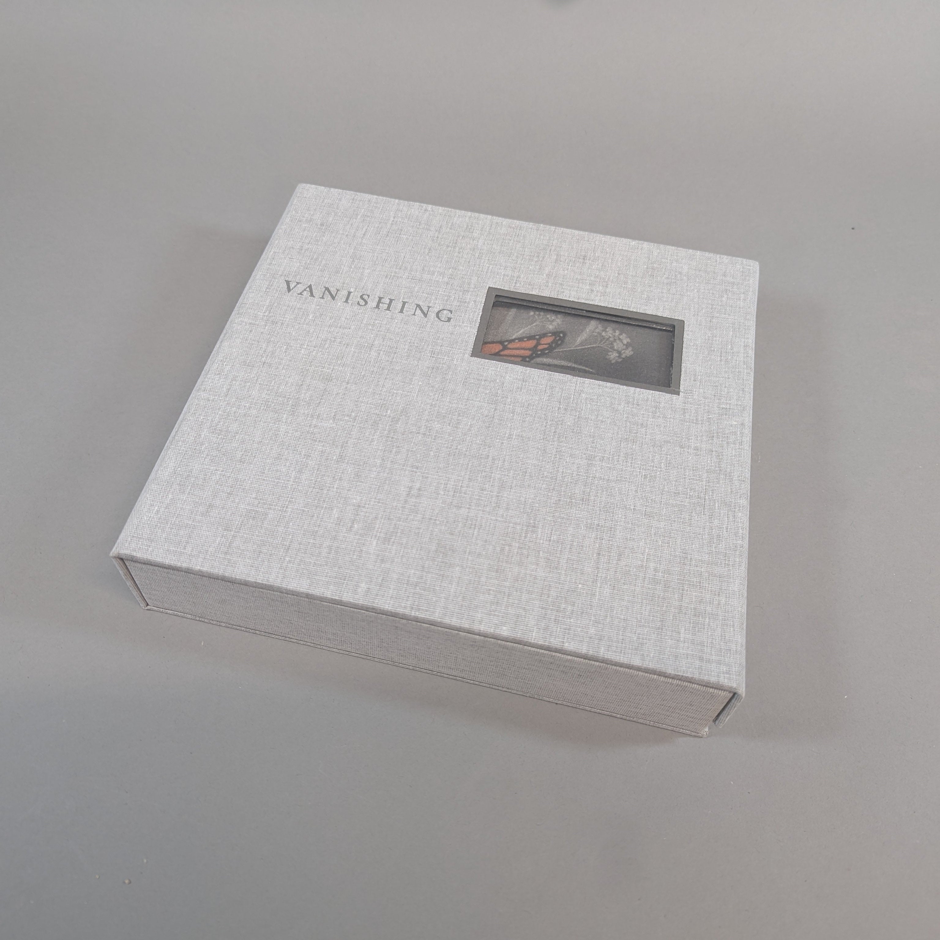 The papers are Rives BFK from France, Arjowiggins Kea Kolour Vellum Sombre Grey, and a handmade cotton rag that was created by Rhiannon Alpers for the edition. The enclosure is a drop spine magnet box with a museum glass panel in Dubletta bookcloth.