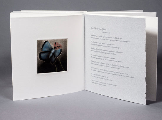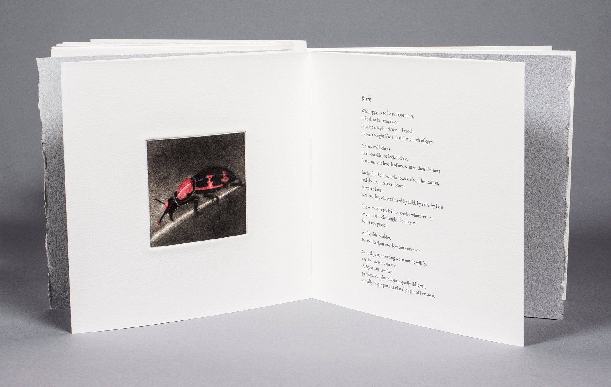Holly Downing engraved and hand-colored the eleven 3” x 3” mezzotints. She was assisted in the editioning process by Toni Stirling in her Sebastopol studio. Rhiannon Alpers designed, letterpress printed, and bound the edition in San Francisco. She also made the handmade paper for the interleaved pages.