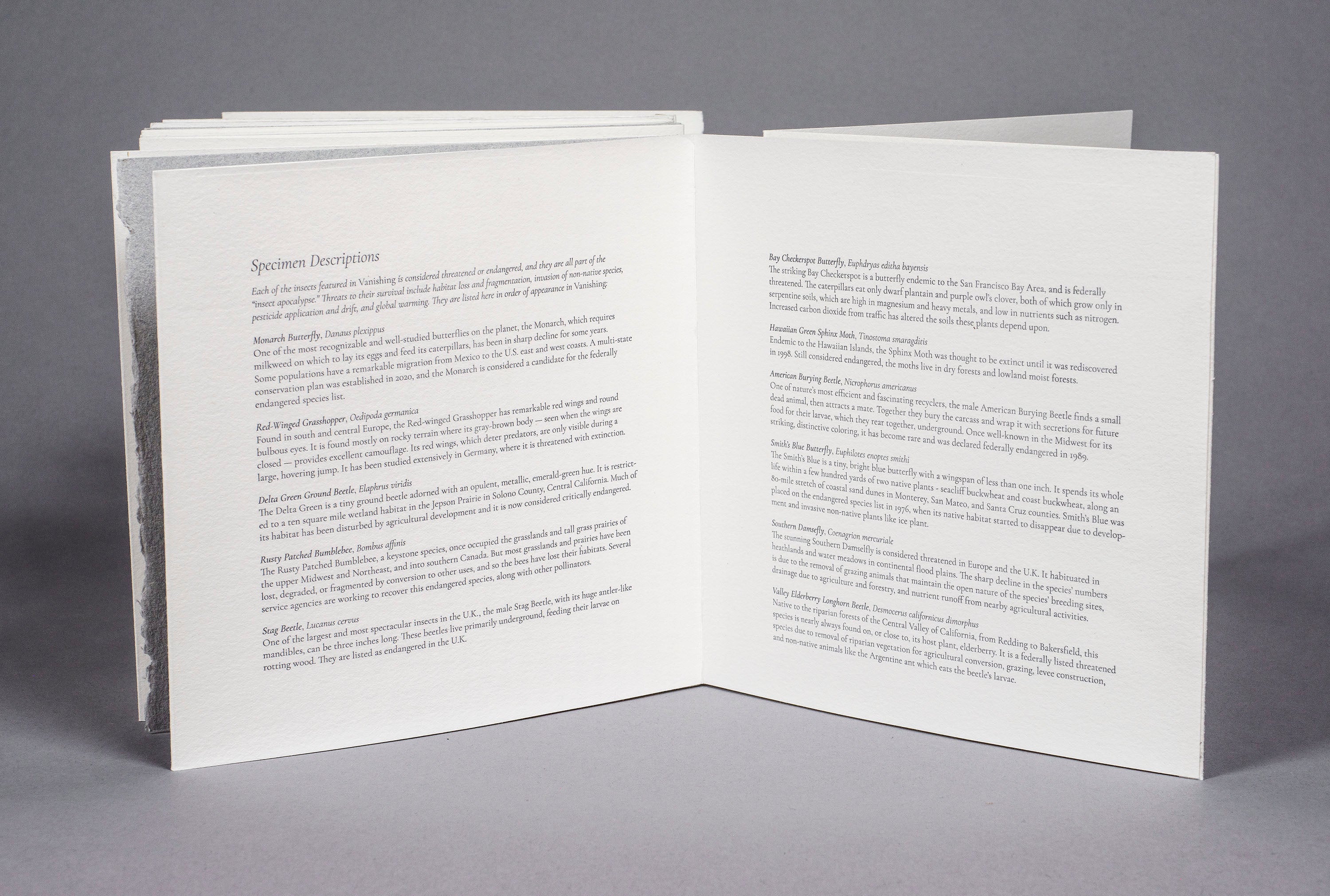 The poetry and imagery in Vanishing revolve around insects currently considered threatened or endangered. They are part of the quote-unquote insect apocalypse. Threats to their survival include habitat loss and fragmentation, invasion of non-native species, pesticide application, and global warming.